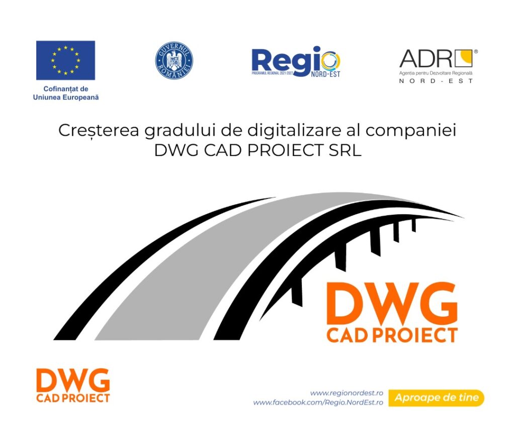DWG CAD PROIECT SRL anunță finalizarea activităților pentru implementarea proiectului ”Creșterea gradului de digitalizare al companiei DWG CAD PROIECT SRL” Cod MySMIS: 318329, cofinanțat prin Fondul European de Dezvoltare Regională, prin Programul Regional Nord-Est 2021-2027, Prioritatea PRNE_P2 O regiune mai digitalizată, apelul de proiecte PR/NE/2023/PI2/RSO1.2/1-DIGITALIZARE IMM.